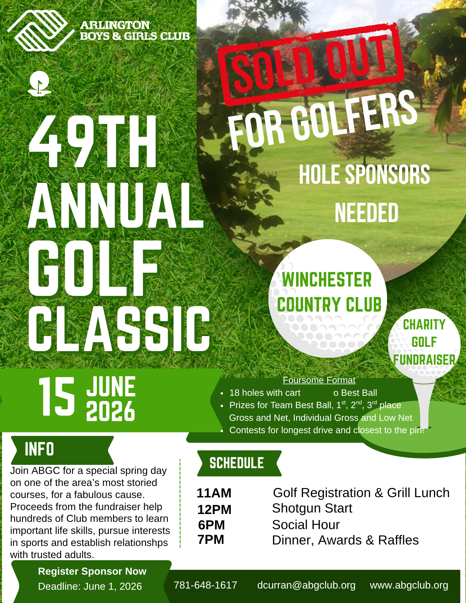 Hole sponsors highlight businesses, honor our beloved or celebrate a milestone! If you would like to sponsor a hole, please complete the form and mail or drop off a check c/o Derek Curran. Please email Jen Goodwin at jgoodwin@abgclub.org if you have a raffle item/service/gift card to donate.